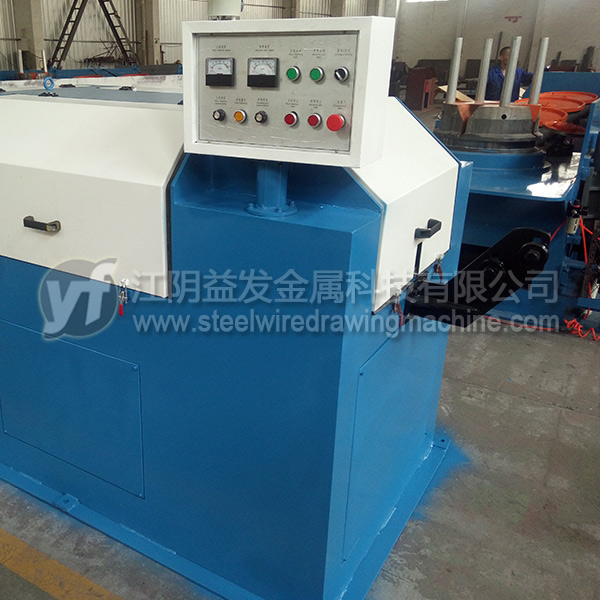 本機采用5.5KW的電機使轉盤圍繞鋼絲360°旋轉,確保鋼絲無遺漏與砂帶接觸,砂帶由5.5KW帶動兩個旋轉的滾筒帶動緊緊壓在線材表面移動,使線材表面被輕微的切削,一般線材表面會被均勻的削除0.03mm,但是砂帶工作時在砂粒之間塞進不斷掉落的氧化皮而使砂帶慢慢失效,通常不會超過24小時,為了提高砂帶的使用壽命,將鋼刷剝殼機放在砂帶機前面,不僅確保鋼絲被100%去除氧化層而且提高砂帶使用時間10倍。